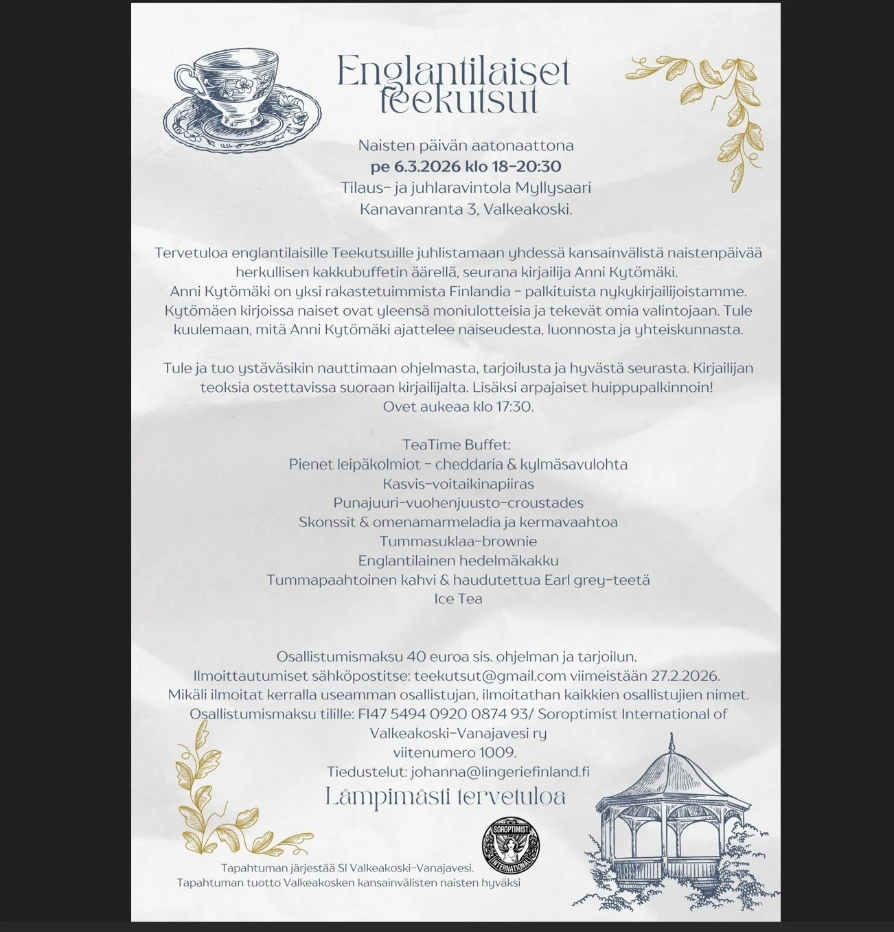 Tervetuloa englantilaisille Teekutsuille juhlistamaan yhdessä kansainvälistä Naistenpäivää herkullisen Tea time buffetin äärellä, vieraana palkittu kirjailija Anni Kytömäki.